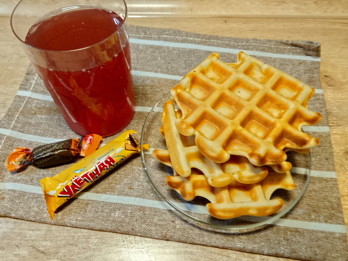 У меня вторая вафельница. Первую уже уработала)) Вафли я пеку разные и часто. Очень нравятся пышные вафли с манной крупой. Для себя готовлю вафли с отрубями или творогом. Рецепты вафель я уже выкладывала. Свою новую вафельницу купила на WB. Сегодня, в принципе, обычные, пышные вафли. Если у вас есть вафельница и вы ей пользуетесь не часто, попробуйте приготовить вафли по этому рецепту. Вафли получаются пышные, мягкие внутри с хрустящей корочкой. Яйцо взбейте с сахаром до полного растворения сахара. Влейте молоко и растопленное, но не горячее, сливочное масло. Смешайте. Всыпьте муку, разрыхлитель и ванилин. Тесто хорошо вымешайте. Вафельницу разогрейте. Вылейте по большой ложке теста на горячие панели. Выпекайте вафли до румяности. Я пекла 5-7 минут, каждую партию вафель. Вафли остудите на решетке. Вафли можно подать на стол с чаем, молоком или компотом. ингредиенты: яйцо - 2 шт. сахар - 2 ст.л. молоко - 50гр. сливочное масло - 35 гр. мука - 100гр. ванилин - 0.5 ч.л. разрыхлитель - 0.5