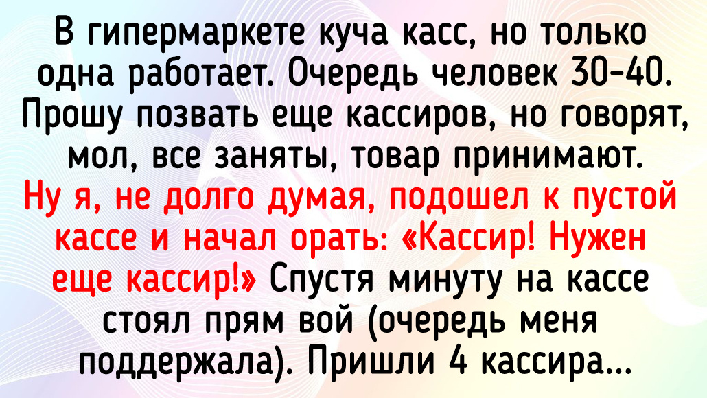 В гипермаркете куча касс, но только одна работает. Очередь человек 30-40. Прошу позвать еще кассиров, но говорят, мол, все заняты, товар принимают. Ну я, не долго думая, подошел к пустой кассе и начал орать: «Кассир! Нужен еще кассир!» Спустя минуту на кассе стоял прям вой (очередь меня поддержала). Пришли 4 кассира. © sda1989 / Pikabu