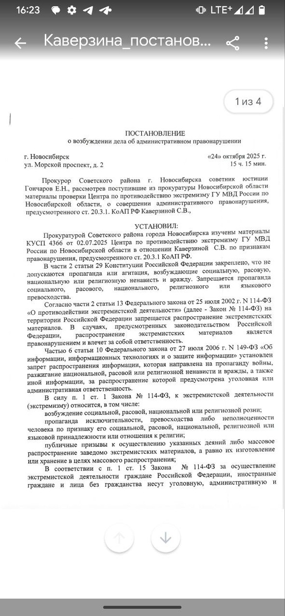Вышли из прокуратуры 18+ НАСТОЯЩИЙ МАТЕРИАЛ (ИНФОРМАЦИЯ) ПРОИЗВЕДЁН, РАСПРОСТРАНЕН И (ИЛИ) НАПРАВЛЕН ИНОСТРАННЫМ АГЕНТОМ КАВЕРЗИНОЙ СВЕТЛАНОЙ ВИКТОРОВНОЙ ЛИБО КАСАЕТСЯ ДЕЯТЕЛЬНОСТИ ИНОСТРАННОГО АГЕНТА КАВЕРЗИНОЙ СВЕТЛАНЫ ВИКТОРОВНЫ* * номер в списке Минюста 777 Очень старый пост, ещё от апреля, где я предупреждаю, что некоторые сотрудники ГИБДД проводят некие мошеннические действия и предупреждаю читателей, что не попадайтесь на эту схему. Несмотря на то, что лингвист возбуждения ненависти не нашёл, а только негативное отношение к конкретным действиям (см. фото 6) (а негативная оценка у нас вроде не запрещена), прокуратура Постановление выдала, дальше в суд. Моё объяснение тоже выкладываю. Нужна будет помощь защитника в суде, если есть возможность - поддержите. Ссылка на карточку защитника, сбор 15 тысяч https://messenger.online.sberbank.ru/sl/GriENmEtdTtJXqbRf