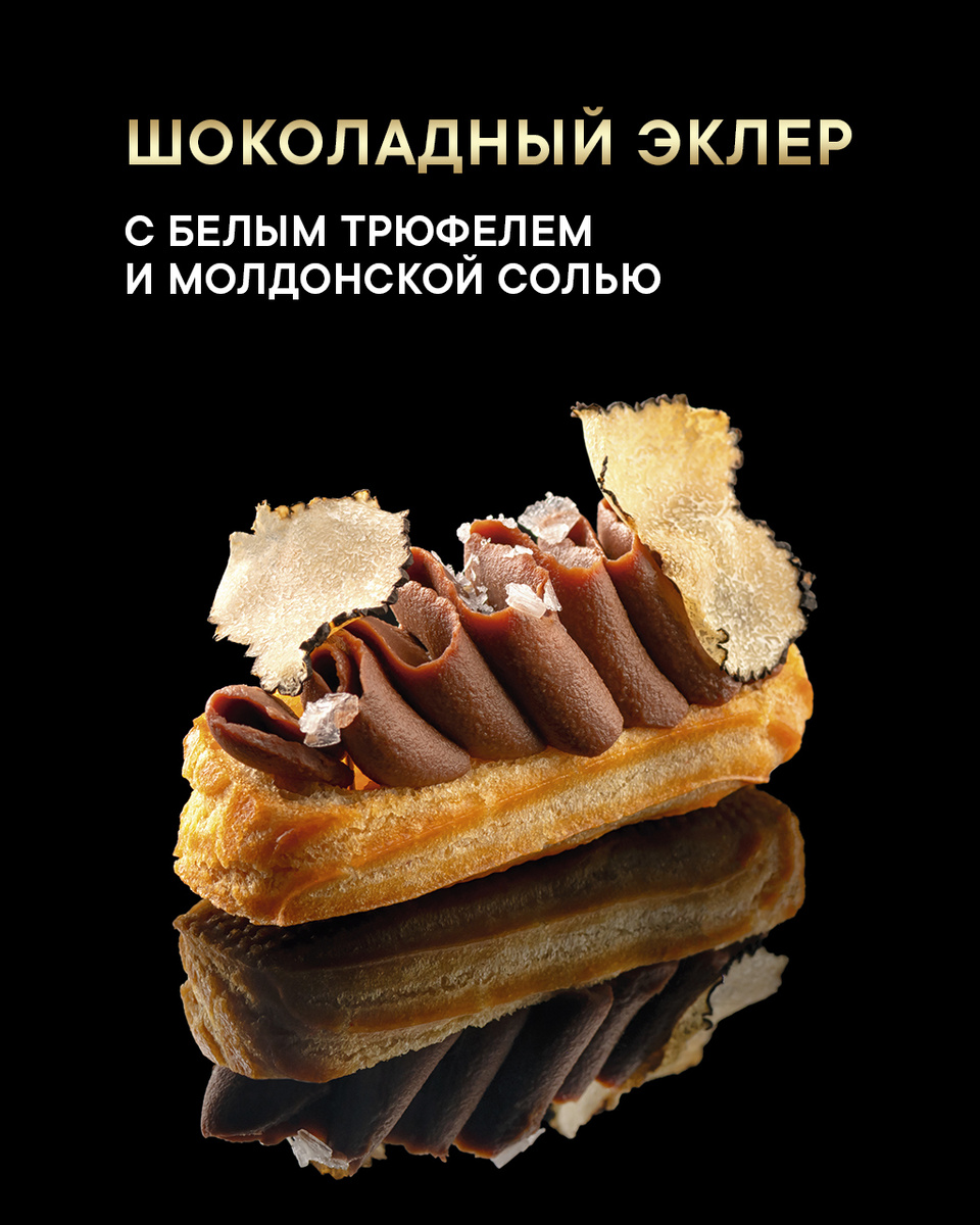 3️⃣ Гармония контрастов. Артём сочетает деликатную сладость шоколадного эклера и «пятый элемент» вкуса — умами, за который отвечают белый трюфель и молдонскаясоль. ИНГРЕДИЕНТЫ Эклеры