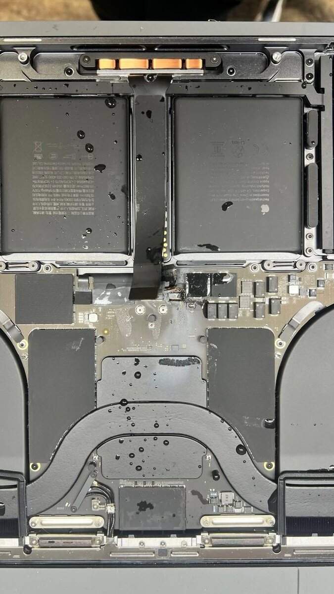 Сильно залитый MacBook Pro 16” M4 Pro. Прогар в плате. До и после ремонта. Работы с ним было много. ✅Компонентный ремонт платы ✅Ремонт кулера ✅Косметическая чистка