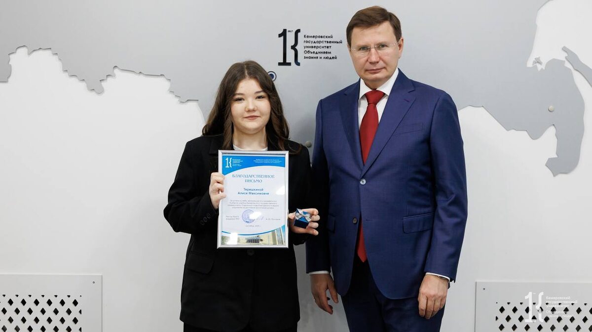 Алиса Терешкина окончила школу №14 города Полысаево с красным аттестатом и поступила в КПИТиП КемГУ на направление «Юриспруденция». «Выбрала КемГУ, поскольку считаю, что в этом университете есть большие возможности для развития в своей профессии и творческих направлениях. Также здесь профессиональные преподаватели. Уверена, что знания, которые я получу, послужат хорошей опорой в будущем. Выбрала направление „Юриспруденция“, потому что мне интересен этот профиль. После обучения я могу продолжить развиваться в разных направлениях». «Красный аттестат я получила только благодаря своим родителям и преподавателям, которые во всем меня поддерживали и помогали в подготовке к экзаменам». «Моим первым впечатлением о КемГУ было ощущение дружеской, рабочей и творческой атмосферы, которая оказалась очень приятной для дальнейшего обучения. Я хотела бы развиваться в Колледже в творческом направлении и получить достойное образование по своей специальности».