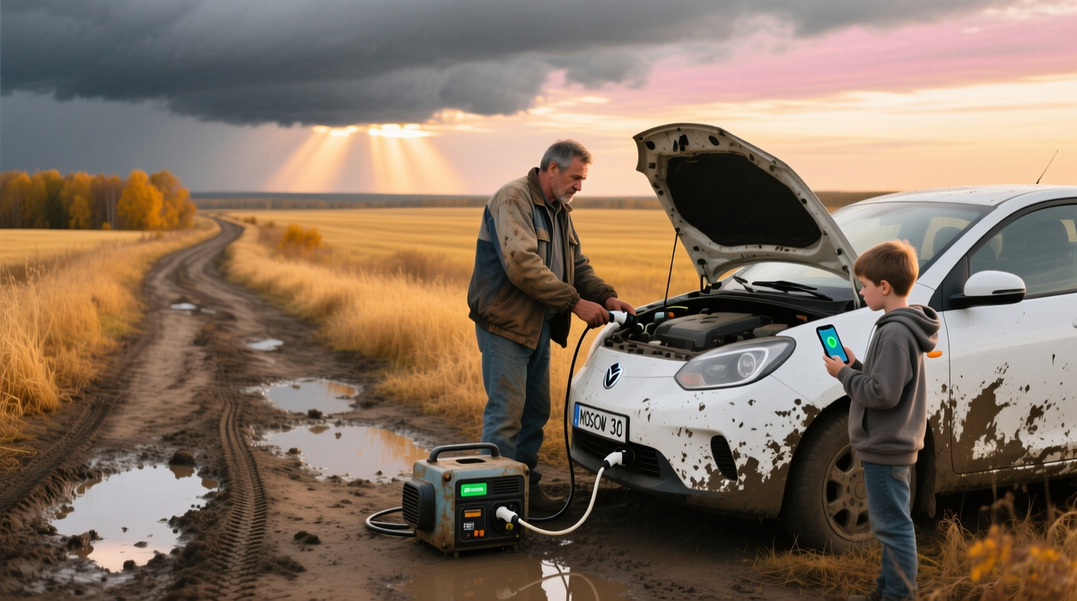 Август. Дожди. Еду в Усмань, 70 километров, на осмотр машины клиенту. App показывает: розетка у местного супермаркета. Приезжаю с 40 процентами, подключаю — медленно, как капает вода. Час — и 50. В это время болтаю с продавцом: "Электромобиль? Редкость здесь". "Да, — отвечаю, — но бензин дороже выходит". По стране зарядок стало больше: к августу 2025-го — 7200 штук, из них 3900 быстрых. В Москве — 900, рост на 64 процента. cnews.ru А в Липецке — пара десятков, плюс планы Росатома на 270 новых к концу года. avtocharge.ru Наташа привыкла: "В магазин едем — заодно заряжаем, если рядом". Сыну купили power bank на 20 тысяч мАч — на всякий, в багажник. Один раз в пути к родственникам в Данков — 120 километров — сели до 15 процентов, заехали к ферме, попросили розетку от дома. Включили — два часа, и поехали. Хозяин удивился: "Никогда не видал". Такие моменты — норма в провинции, учишься импровизировать.