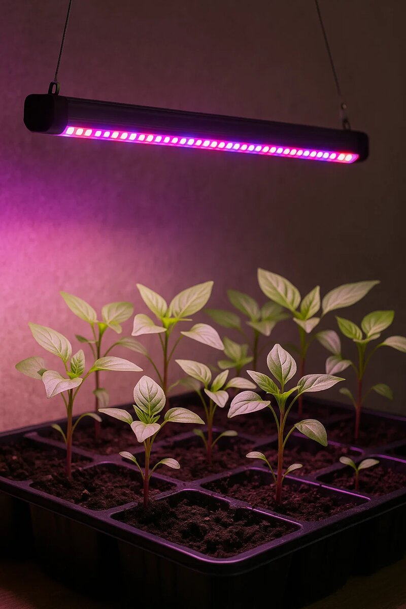 Правильное освещение — залог здоровой и крепкой рассады. Светодиодные фитолампы эффективно заменяют солнечный свет, но важно грамотно их подобрать и использовать. Для полноценного развития растений необходимы два основных диапазона: Синий спектр (440-450 нм) Красный спектр (650-660 нм) Современные решения: Полноспектральные фитолампы (full spectrum) содержат дополнительные пики в оранжевом, зеленом и УФ-диапазонах, что делает свет максимально приближенным к естественному солнечному. Мощность подбирается в зависимости от расположения рассады: На подоконнике (с естественным освещением): В глубине комнаты (без естественного света): По мощности: Важно: Обращайте внимание на реальную, а не номинальную мощность. Производители часто указывают эквивалентную мощность, что вводит в заблуждение. Высота подвеса зависит от мощности лампы: Признаки неправильного размещения: Светолюбивые культуры (томаты, перцы, баклажаны, огурцы): Зеленные культуры (салаты, укроп, петрушка): Туговсхожие растения (се
