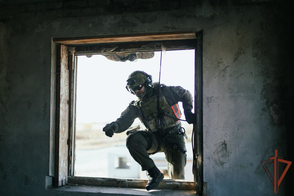 В ходе тренировок спецназовцы выполнили слаженный штурм многоэтажного здания, где, по легенде, укрылся вооруженный преступник. Спецназовцы одновременно заходили через подъезд и спускались с крыши, используя альпинистское снаряжение.