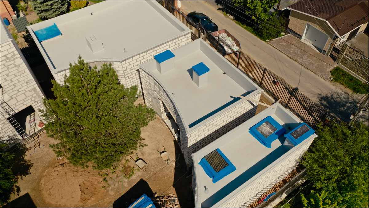 - Полусухая стяжка. Здесь цемент, песок и фиброволокно привозим на объект отдельно и перемешиваем непосредственно на месте. Далее с помощью специальной установки через шланги готовый раствор поднимаем на кровлю. Такой способ укладки цементно-песчаной стяжки сэкономит вам как минимум 30%, а высыхать раствор будет в разы быстрее. Поэтому своим заказчикам мы в Roof Development всегда рекомендуем именно эту технологию.