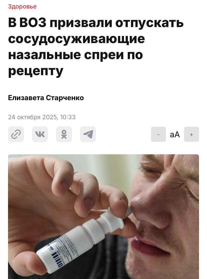 Вы знали, что обычные капли для носа могут вызывать зависимость — не хуже кофеина или сигарет? 😱 Многие даже не подозревают, что привычка “прокапаться перед сном” превращается в реальное заболевание — медикаментозный ринит. Всё начинается безобидно: простуда, насморк, пара дней с каплями, чтобы «просто дышать». Но спустя неделю нос уже не открывается без очередной дозы. 🔹 Виноваты сосудосуживающие вещества — ксилометазолин, оксиметазолин, нафазолин. Они заставляют сосуды слизистой сужаться, снимают отёк, и вы начинаете дышать легче. Но… организм быстро адаптируется. Через 5–7 дней рецепторы перестают реагировать, сосуды перестают сужаться сами. Результат — отёк возвращается, и человеку кажется, что без капель он «захлебнётся». Это и есть капельная зависимость, или ринит медикаментозный. 🧾 По данным фармрынка России, ежегодно продаются миллионы флаконов сосудосуживающих капель. Только за 2024 год россияне потратили более 6 миллиардов рублей на препараты от заложенности носа.