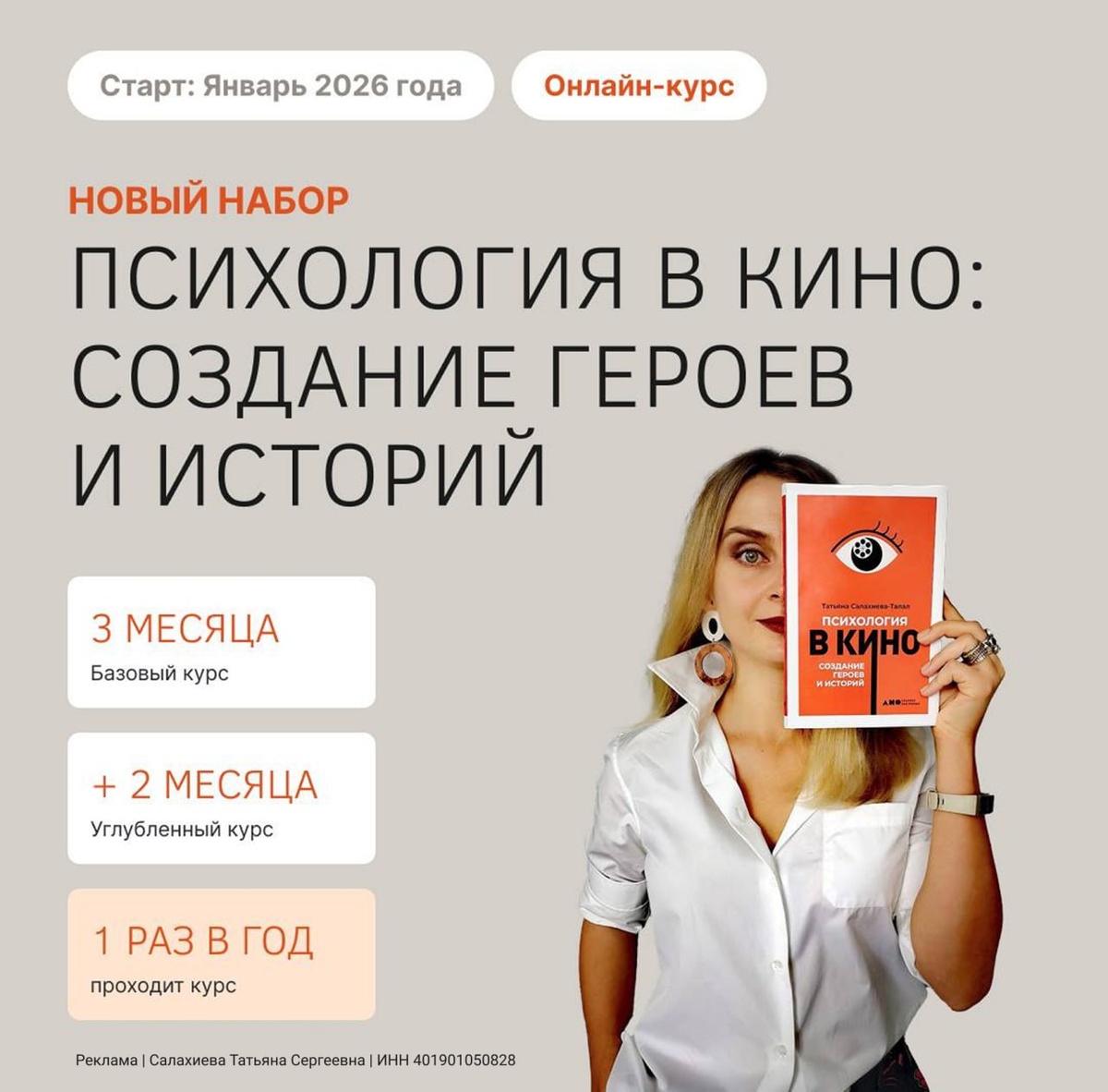 Привет, друзья! Сегодня я хочу поговорить о книге «Психология в кино» Татьяны Салахиевой-Талал. Эта работа стала незаменимым ресурсом для редакторов и опытных сценаристов при разборе сценариев. По отзывам, она даёт больше, чем иные учебники по трёхактной структуре. Создание ярких и запоминающихся персонажей — ключевой элемент успешного кино. Книга Татьяны помогает понять, как оживить героев, сделать их характеры сложными и многогранными. Это особенно важно для сценаристов, режиссёров, продюсеров и всех, кто работает с историями. На основе книги Татьяна Салахиева-Талал разработала специальный курс «Психология в кино: создание героев и историй 2026». Курс проходит один раз в год, и следующий набор будет только через год. За три месяца базового курса участники прослушают 12 вебинаров по 4 часа, поучаствуют в закрытом чате с ответами на вопросы, получат внеаудиторные материалы и смогут провести практический разбор фильмов. Углублённый курс, который начнётся сразу после базового, погрузит с