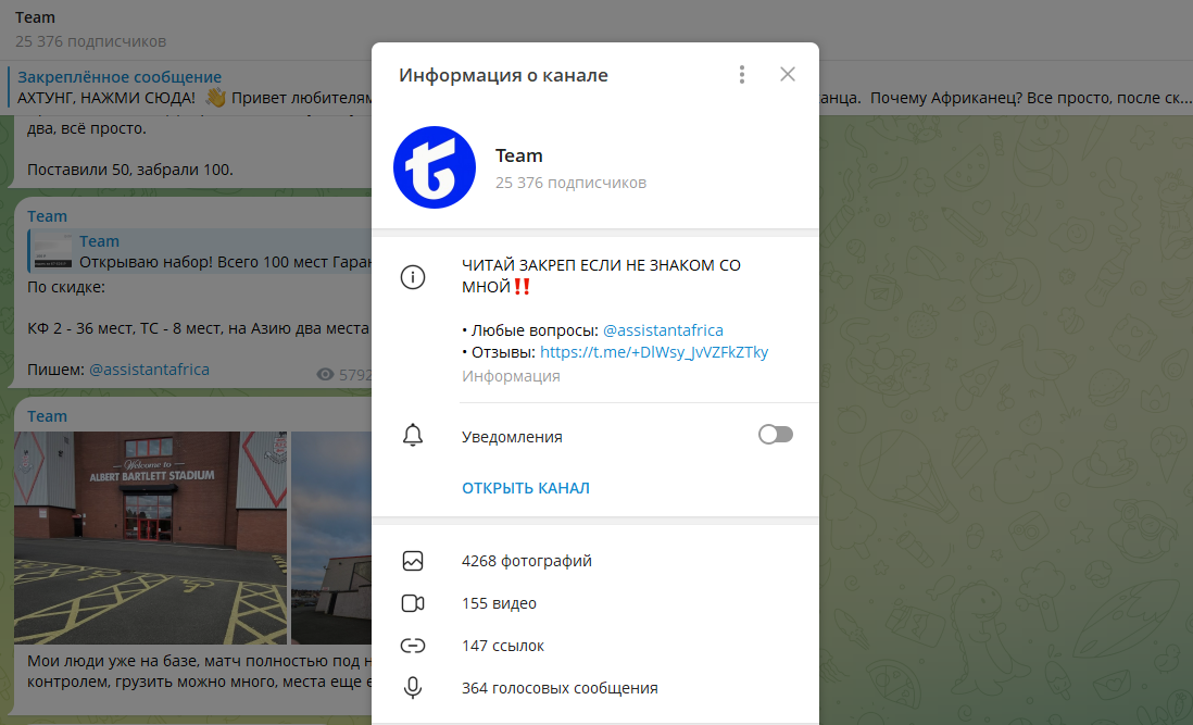 Телеграм-канал Team — очередная попытка скандально известного каппера Африканца воскресить свой старый скам под новой вывеской. После череды разоблачений он снова запустил канал, где обещает подписчикам «договорные матчи», «внутренние инсайды» и стопроцентную проходимость сигналов. Схема знакома до боли: громкие обещания, липовые результаты и быстрое исчезновение, как только поток денег иссякает. ✅ Хотите зарабатывать без риска попасть в такие ловушки? Проверенный способ без инсайдов и сливов здесь. По старой схеме Африканец снова выдает себя за «Игоря» — якобы опытного каппера с доступом к «трём богатырям-инсайдерам».
