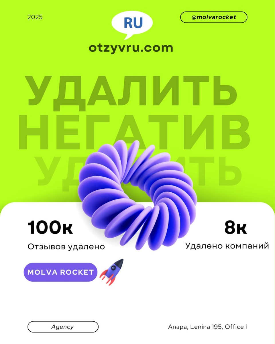 Клевета на otzyvru.com опасна для бизнеса Сотрудники читают отзывы Работники доверяют всему, что написано в интернете otzyvru.com популярен На этом сайте много полезных реальных отзывов сотрудников otzyvru.com не удаляет отзывы за деньги Негатив проходит модерацию проще, чем положительные отзывы Отзывы могут комментировать Негативные отзывы привлекают ещё больше негатива в комментариях Отклоняет большинство непрофессиональных жалоб Как мы работаем с otzyvru.com 1. Изучаем тексты отзывов на наличие нарушений 2. Составляем досудебные претензии для каждого отзыва 3. Направляем их юридическому отделу otzyvru.com 4. Далее идет деловая переписка с их юристами 5. Часть претензий принимают, часть отклоняют, но данный вопрос быстро решаем. 6. Удаление отрицательных отзывов или страницы компании в целом, проводим стабильно в течении одного дня Обращайтесь ⚡️ https://t.me/mmrtumanov molva-rocket.ru 8 (800) 101-91-27