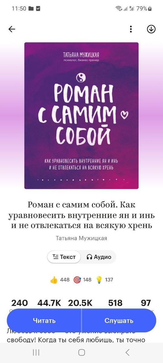 Есть инь, есть ян, а есть хрень. Так автор описывает три состояния человека. И конечно, себя хорошо узнаешь именно в "хрени") Книгу хочется разбирать на цитаты, сохранять в заметках и периодически перечитывать. Что я, собственно, сделала сразу во время прочтения и теперь уже несколько месяцев возвращаюсь к записям. Книги Мужицкой, как и её интервью, всегда заряжают каким-то позитивом и верой в чудо, во вселенную и в то, что все в твоих руках. Кстати, один из немногих авторов, кого я люблю ещё и слушать в аудио – она всегда добавляет щепоточку юмора, какой-то забавный комментарий, чего нет в тексте, как будто играет со слушателем – и это классно 🔥 В общем, если есть ощущение, что вы застряли не в том состоянии и не знаете, что с этим делать – очень рекомендую срочно завести роман с самим собой💞. И постараться все таки ограничить дозу восприятия книги, чтобы не проглотить текст целиком и продлить удовольствие) 🔎 Где найти: Я.Книги (букмейт) Литрес #читаю_запоем #чз_нонфикшн #пси