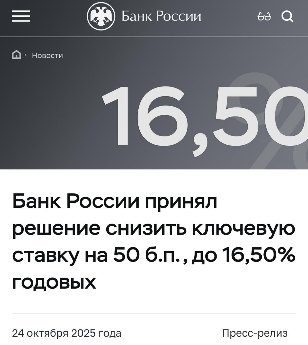⚡️Совет директоров Банка России 24 октября 2025 года принял решение снизить ключевую ставку на 50 б.п., до 16,50% годовых. Устойчивые показатели текущего роста цен значимо не изменились и остаются выше 4% в пересчете на год. Экономика продолжает возвращаться к траектории сбалансированного роста. В последние месяцы активизировался рост кредитования. Высокими остаются инфляционные ожидания.