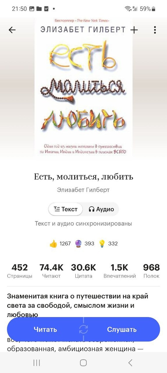 Возможно, вы видели экранизацию этой книги с Джулией Робертс в главной роли. Фильм хорош, но книга сильно лучше) Впервые я её прочитала довольно давно, и иногда возвращаюсь к конкретным частям книги: Италии (есть), Индии (молиться) либо Индонезии (любить). Чего скрывать, особенно люблю итальянскую часть – представьте себе описание вкуса пиццы на 1,5 страницы, которое буквально перекатывается на языке, в котором вы не пропускаете ни строчки... Редкость, чтобы умели вкусно писать про еду) Книга хороша. Читая её, вы будто и сами попадаете в уединение с собой: анализируете и ощущаете свое состояние, начинаете размышлять. Она затрагивает множество тем, героиня пребывает в разных обстоятельствах и настроении, показана так реалистично, что сразу ощущаешь её настоящей: живой и понятной. Даже если возникают вполне практичные вопросы из разряда "сколько нужно накопить, чтобы столько путешествовать", они не сбивают с сюжета. Рекомендую, если хочется поразмышлять. Хотя бы прочтите до окончания