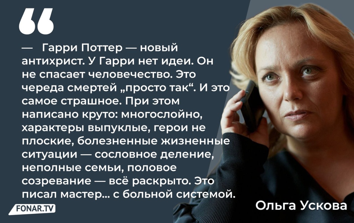 Когда в Белгород приезжает писательница и предпринимательница Ольга Ускова, это практически всегда какое-то необычное событие. Так вышло и на этот раз. Журналистов позвали на презентацию новой книги Усковой для взрослых «Аминь» (18+), а на деле получился откровенный разговор о творчестве, искусственном интеллекте, книгах о Гарри Поттере, а ещё случилось небольшое погружение в «мировое закулисье» (ну, почти). Раскрываем подробности. По ссылке для вас — много про книгу и про отдельные моменты — про маленького мальчика, разговаривающего с могилой погибшего отца, или про служительницу монастыря, которая разрубила дрон топором, но отдельно мы бы хотели привести мнение Ольги Усковой о серии книг о Гарри Поттере. Оно, как нам кажется, довольно неожиданное. 🔦Подпишись на «Фонарь». У слов появляется сила, если вы с нами. Не ждите, ваша помощь нужна нам сейчас! Мы с вами на сайте, ВК, ОК, в Max и тут.