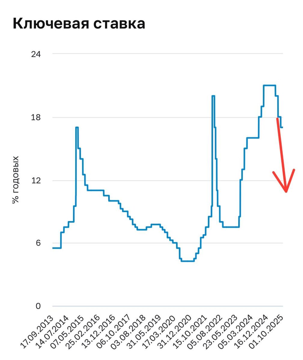 ⚡️Банк России снизил ключевую ставку с 17 до 16,5% Тренд на снижение сохраняется, но ЦБ осторожничает📉 Оно и понятно. Предстоящее повышение налогов приведет к росту цен, а это высокая инфляция, с которой и борется ключевая ставка. Поэтому в ближайшее время может быть замедление темпов снижения ставки или даже временная приостановка. Пока экономика не адаптируется к новым ставкам налогов. На это может уйти 3-6 месяцев. А потом снижение продолжится. Потому что высокая ставка - вредно для экономики и она не будет держаться вечно. Что и видно на графике, если посмотреть динамику за последние 13 лет⬆️ - после пиковых значений ставку всегда снижали. Так что высокие доходности по вкладам не будут с нами вечно, снижение неизбежно. И чем раньше вы это поймете, тем больше правильных финансовых решений сможете принять уже сейчас