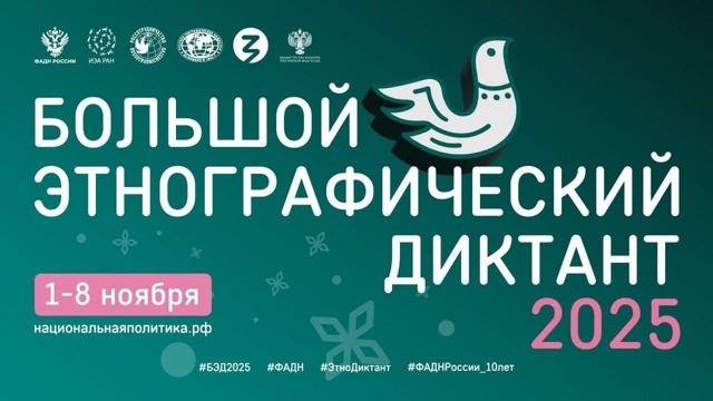 С 1 по 8 ноября во всех субъектах Российской Федерации и зарубежных странах пройдет десятая, юбилейная, Всероссийская просветительская акция «Большой этнографический диктант» под лозунгом «Народов много–страна одна!" Задания будут доступны с 1 ноября по 8 ноября на официальном сайте диктанта miretno.ru