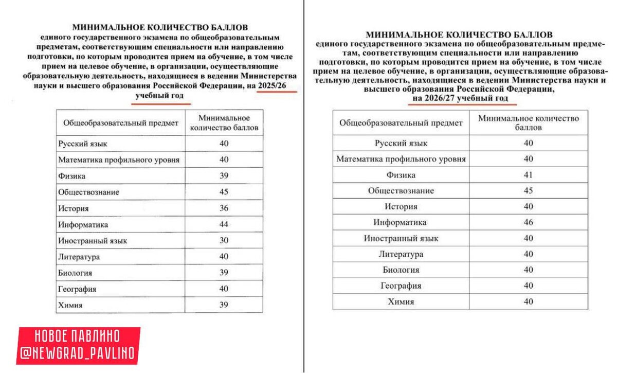 😢 В вузах повысят минимальные баллы ЕГЭ с 2026/27 учебного года — требования стали еще строже • Химия: 40 вместо 39 • Биология: 40 вместо 39 • Физика: 41 вместо 39 • Информатика: 46 вместо 44 • История: 40 вместо 36 • Иностранный язык: 40 вместо 30 Университеты не смогут устанавливать пороги ниже данных значений. Мы в 📲 max.ru/newgrad_pavlino ⚠️НОВОЕ ПАВЛИНО 🆕🆕🆕🆕🆕🆕🍃 Прислать новость|Подписаться 🎩