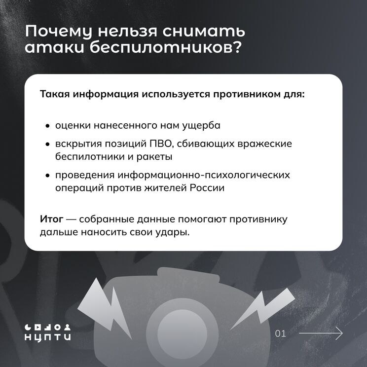 ЗАПРЕЩЕНО: делать и выкладывать в соцсетях и мессенджерах фото и видео атаки беспилотников, а также последствий атаки! За нарушение запрета последует наказание.