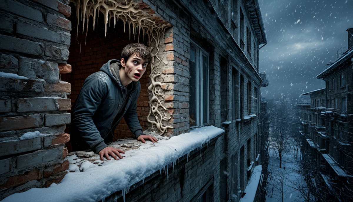 Я стоял на узком карнизе, в одних штанах и майке, держась за обломки стены.
