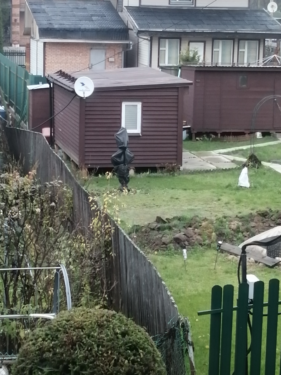 Это некое мини-творчество, созданное в эпоху спешки, когда приезжаешь на час-два на дачу, а перед тобой стоит глобальная задача укрыть деревья на зиму, занавесить террасу дома , убрать уличную мебель и прикрыть несколько роз и гортензий. Тут уже не до красивостей, как получилось, так и получилось. Но в некоторых людях изначально творчество внутри присутствует, поэтому и результаты соответственные. Соседи заканчивали работу уже в темноте, поэтому сюрприз меня ждал утром.
