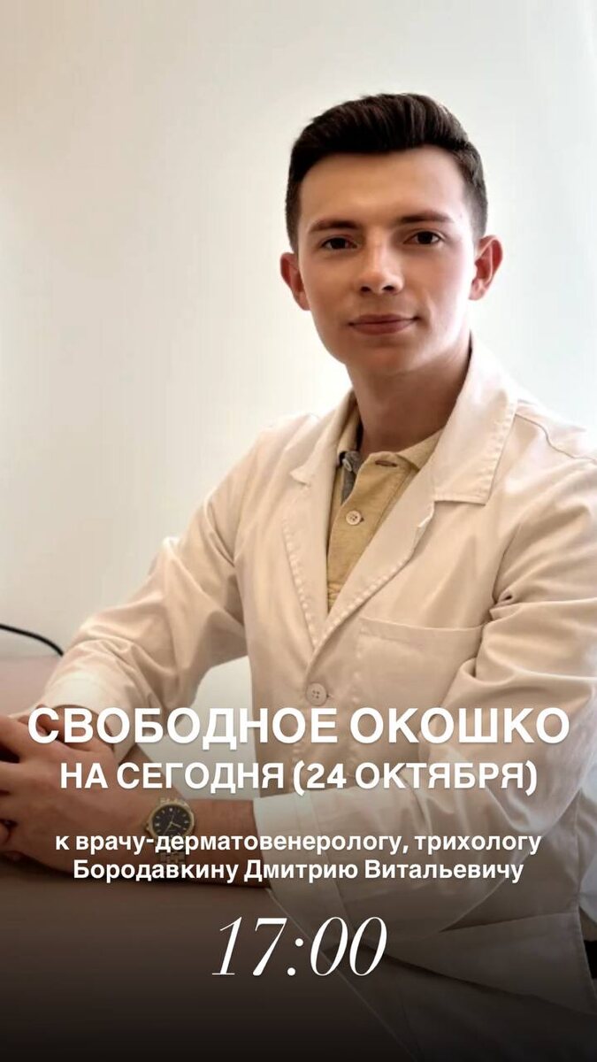 На сегодня есть свободное окошко к врачу-дерматовенерологу, трихологу Бородавкину Дмитрию Витальевичу 🙌🏻