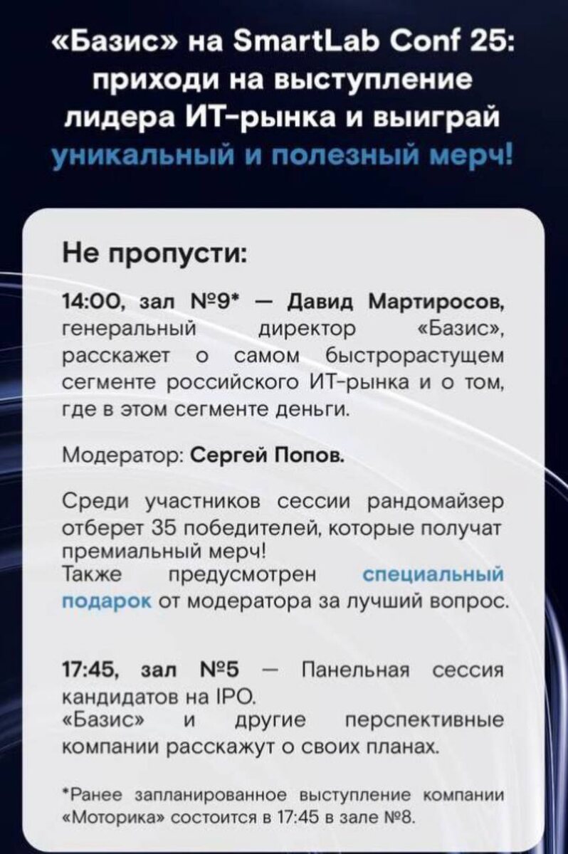 Уже завтра будет одно из самых интересных событий, это конференция Смартлаба. На связи Сергей Попов. Помимо всего, что мне очень нравится в ней, там откроются новые имена. Завтра придет один из лидеров в своей айтишной нише - компания Базис. Очень советую прийти, вникнуть в компанию (по слухам, как будто бы…ну вы поняли) Обещают интересный стенд с интересными девушками, а заодно розыгрыш мерча на презентации в 14:00 в зале 9 (!), так что не пропускайте. Как модератор сделаю все возможное, чтобы раскрыть для вас компанию, ибо ИТ непростой сектор. Пока впечатление такое, ребята молодцы. Заявляют, что у них единственная на рынке экосистема виртуализации с собственной кодовой базой, конкуренты позади и все такое. Подразберемся, почему не опенсорс, что опять за экосистема, зачем нужна кодовая база и прочее. И, да, я впервые буду не в олимпийке/свитшоте, а в рубашке и пиджаке - на это тоже надо прийти посмотреть) до завтра!