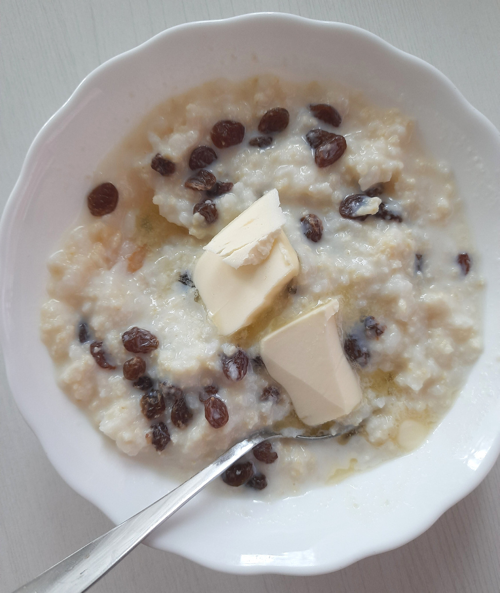 #Завтрак – цикорий с фермерским молоком за кадром. Каша Дружба – пшено и круглый рис. Сварена на молоко-воде, без сахара, но добавила много изюма. И сливочное масло.