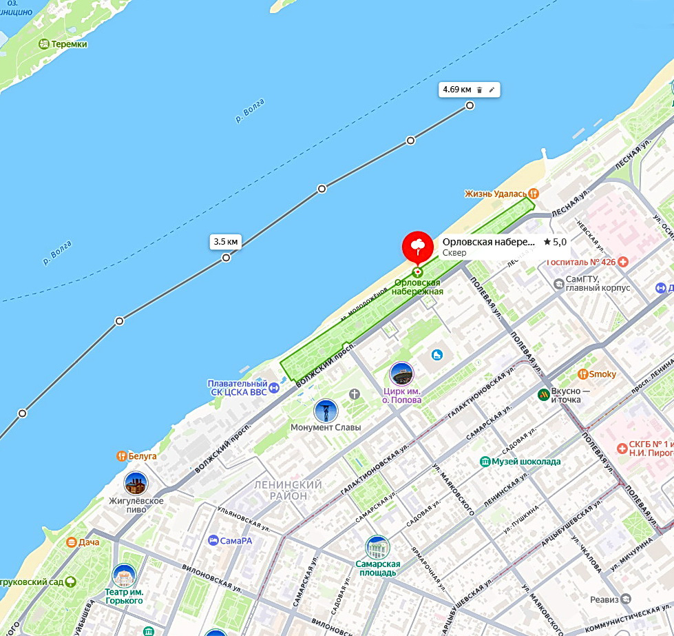 В предыдущей статье наш теплоход прошёл первые 2 километра круизного маршрута вверх по Волге вдоль 3-й и 1-й очередей Самарской набережной. Общая длина набережной более 4 километров, это без учёта протяжённости территорий Жигулёвского пивоваренного завода и Самарской ГРЭС (более 1 километра), которые делят набережную на два участка. С этих предприятий, с переходом на вторую очередь набережной, и начнётся сегодняшний обзор самарского берега. Одно время в СМИ появлялась информация о планах соединения первой и второй очередей ещё одним участком набережной, который размещался бы на сваях перед двумя старинными предприятиями. Картинки были красивые, но дело дальше (надеюсь – пока) не пошло. На снимке – северная часть первой очереди набережной перед Вилоновской улицей. При пересечении с Вилоновской улицей заканчивается улица Максима Горького и начинается Волжский проспект. На углу проспекта и Вилоновской находится Иверский монастырь – за деревьями Струковского сада видны колокольня и златог