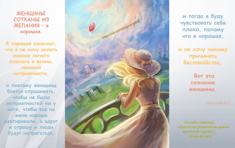 ЖЕНЩИНЫ СОТКАНЫ ИЗ ЖЕЛАНИЯ – я хорошая. Я хорошая означает, что я не хочу делать никому ничего плохого в жизни, никакой неприятности, и поэтому женщины боятся спрашивать, чтобы не было неприятностей ни у кого, чтобы все на меня хорошо реагировали, а вдруг я спрошу и люди будут напрягаться, и тогда я буду чувствовать себя плохо, потому что я хорошая, и не хочу никому причинять беспокойства. Вот это сознание женщины.
