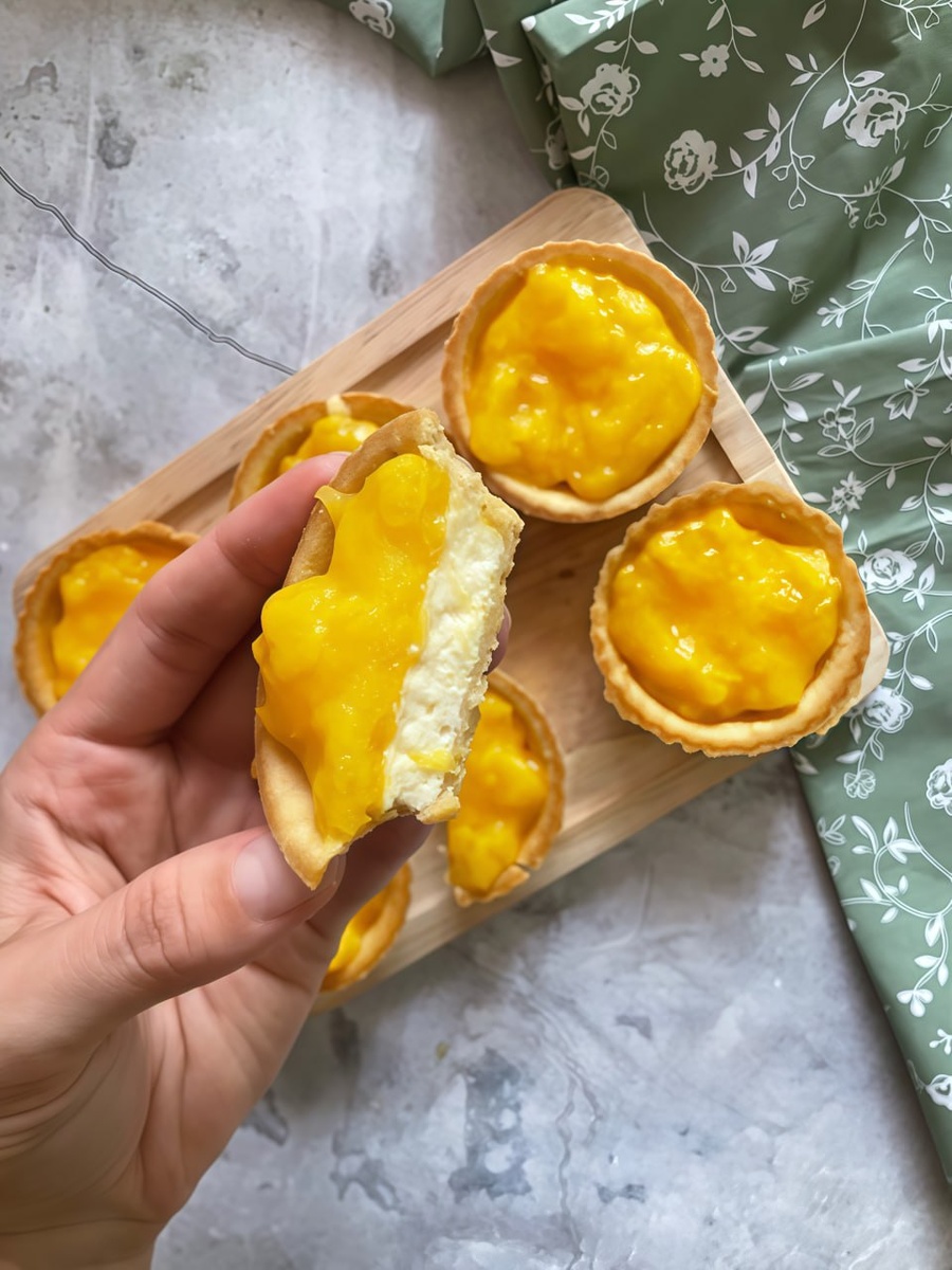 5️⃣ Готовые тарталетки достать из духовки и остудить до комнатной температуры. Сверху выложить приготовленную манговую начинку. Отправить десерт в холодильник на 10 минут для застывания.