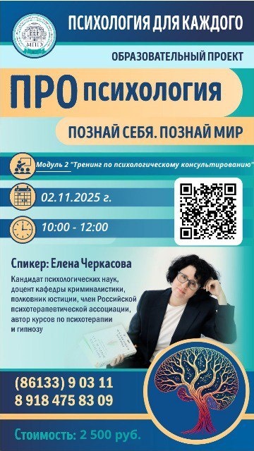 Центр непрерывного дополнительного образования и инноваций Анапского филиала МПГУ объявляет о запуске новых образовательных мероприятий в рамках проекта «ПРОпсихология» Если вы хотите углубить свои знания в психологии и научиться эффективно применять их в повседневной жизни, приглашаем вас присоединиться к мероприятиям! 👇Спикер: Елена Сергеевна Черкасова, канд. психол. наук, доцент кафедры криминалистики, член Российской психотерапевтической ассоциации: 🙌Тренинг по психологическому консультированию 02.11. 10:00 - 12:00 Цена: 2 500 руб. 👇Спикер: Алексей Анатольевич Успеньев, клинический и интегративный психолог, психосоматолог, коуч, Москва: 📚Практический семинар «Эмоциональный интеллект» 26.10. 10:00 - 12:00 Цена: 2 000 руб. ✅Присоединяйтесь к нам и открывайте новые горизонты своего личностного роста вместе с проектом «ПРОпсихология»! 🖊Запись на мероприятие доступна по QR-коду! ☎️Тел: 8-86133-9-03-11, 8-918-475-83-09 📍Адрес: Анапа, ул. Астраханская, 88, каб. 212 18+
