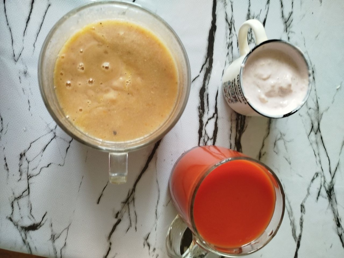 Обед: Гороховый суп пюре, детский творог, томатный сок