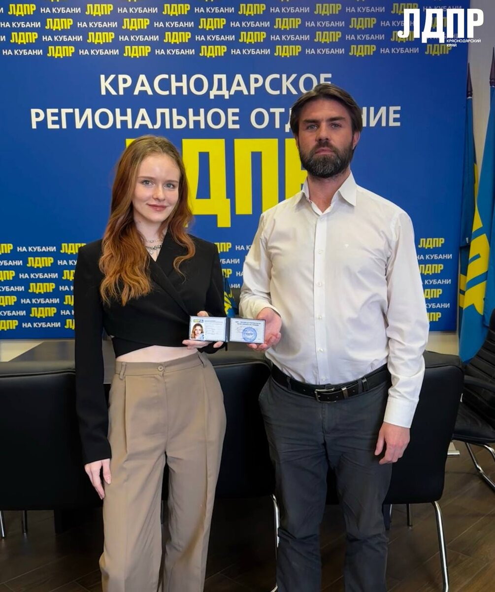 Встречаем пополнение в наших рядах! 🔹 Наша команда становится еще сильнее! Сегодня мы рады приветствовать нового члена ЛДПР – Руслану! За плечами Русланы – годы активной работы в Молодежной организации ЛДПР в Москве. Теперь, когда она переехала в Краснодарский край, ее энергия и целеустремленность нашли своё место и здесь! 💪 Руслана готова с головой погрузиться в выполнение боевых задач и вносить свой вклад в развитие нашего региона! Партийный билет Руслане торжественно вручён 1-м заместителем координатора регионального отделения ЛДПР! Добро пожаловать в команду, Руслана! Вместе мы сила! ♥