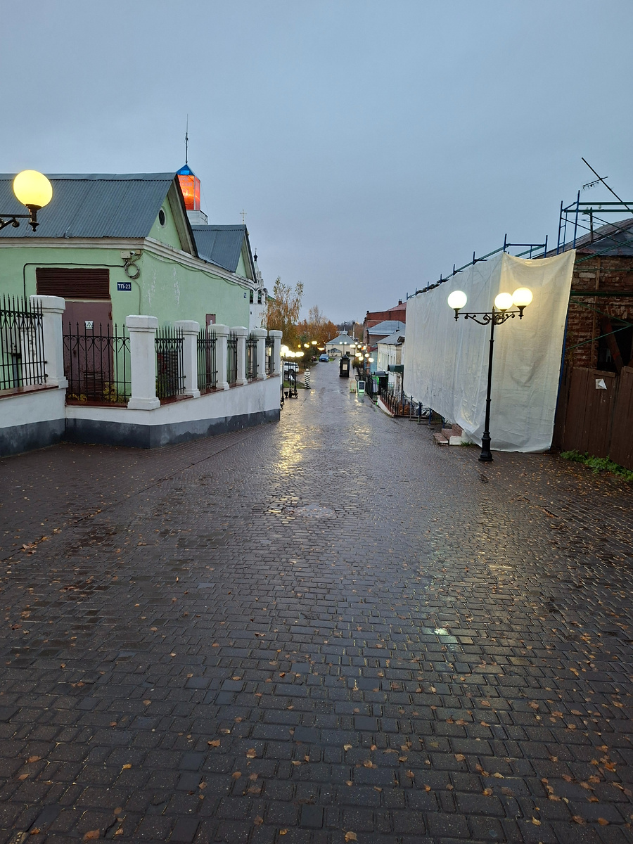 В Москве - Старый Арбат, у нас в Казани - улица Баумана. Во Владимире, оказывается, тоже есть пешеходная улица - Георгиевская. Улица начинается неподалеку от Золотых ворот — древнего символа Владимирского княжества. Она тянется параллельно Большой Московской улице. Хотя "тянется " - это я преувеличиваю. Улица небольшая. Тем не менее, это настоящая достопримечательность, наполненная историей, атмосферой старины и духом творчества. Подозреваю, что это место не особо популярное, в 4 часа вечера (правда в будний день) здесь не было ни одной живой души. Но были души, воплощенные в камне, бронзе и меди :)) Дело в том, что улица Георгиевская - это собрание удивительных миниатюрных скульптур. Их там очень много, покажу лишь часть из них. Встречает вас вот такой "Художник на плэнэре". Позади ещё и смотровая площадка: Так как дело было уже в сумерках, то вот этот "Актёр" , выглядывающий из-за тумбы, меня дико наnyгал. Афиша на самой тумбе бумажная, с актуальными событиями: Аптекарь,