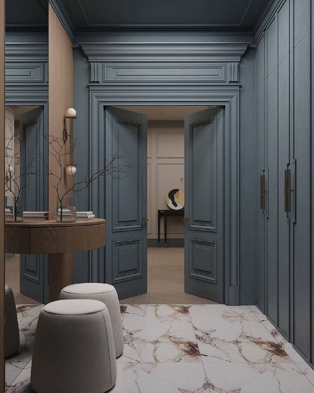 Рождается пространство, где царит тихая музыка стиля – мелодия, в которой нет места суете, а есть лишь сдержанный ритм элегантности. Это не просто интерьер, а воплощение безмолвной роскоши, где каждая деталь – тщательно взвешенное слово в поэме о гармонии. Палитра его подобна утреннему туману над озером: дымчато-серые и приглушенные синие тона стен нашептывают о спокойствии и ясности. И словно луч заходящего солнца, пробивающийся сквозь облака, в эту прохладу вплетается тепло натурального дерева, рождая чувство глубокого, почти осязаемого уюта. Вся композиция подчинена четкому, почти математическому ритму симметрии, создавая идеальный баланс, который успокаивает душу, как вид безупречно ровного горизонта. Стены, одетые в благородные сине-серые одеяния, украшены строгим кружевом молдингов, отсылающим к вечной классике. Им вторит живая текстура деревянных панелей, чье медовое дыхание смягчает холодную элегантность и приглашает прикоснуться. Под ногами же расстилается мраморная плитка с т