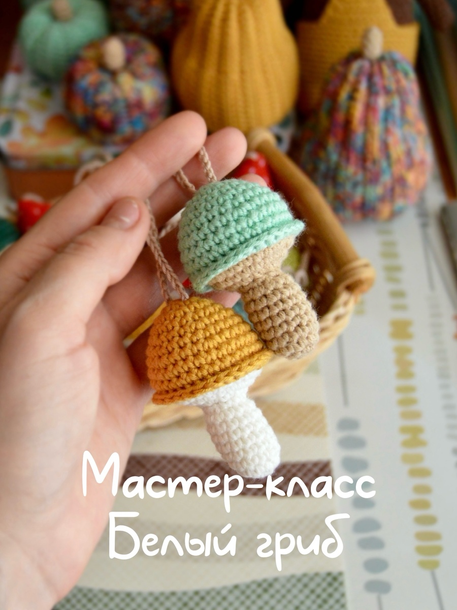 Обозначения: сбн – столбик без накида вп – воздушная петля сс – соединительный столбик пр – прибавка уб – убавка (…) – количество петель в ряду х6 – повторить 6 раз Материалы, инструменты: Gazzal baby cotton, 3410 тёплый белый Gazzal baby cotton, 3447 горчица Мерсеризованный хлопок Demi, 78 Крючок 2 мм, ножницы, синтепух. НОЖКА (фото 1-4) 1 ряд: 6 сбн в кольцо амигуруми 2 ряд: (пр)х6 (12) 3-8 ряд: 6 рядов без изменений (12) 9 ряд: (2 сбн, уб)х3 (9) 10 ряд: (пр)х9 (18). Набиваем. 11 ряд: (2 сбн, пр)х6 (24) 12 ряд: (3 сбн, пр)х6 (30) Обрезаем и закрепляем нить. ШЛЯПКА (фото 5-6) 1 ряд: 6 сбн в кольцо амигуруми 2 ряд: (пр)х6 (12) 3 ряд: (1 сбн, пр)х6 (18) 4 ряд: без изменений (18) 5 ряд: (2 сбн, пр)х6 (24) 6 ряд: без изменений (24) 7 ряд: (3 сбн, пр)х6 (30) 8-9 ряд: без изменений (30) Нить не обрезаем, продолжаем вязание. Вводим крючок в петлю последнего ряда ножки (фото 7). Захватываем рабочую нить, протягиваем через петлю шляпки, набираем одну вп (фото 8). Провязываем ряд