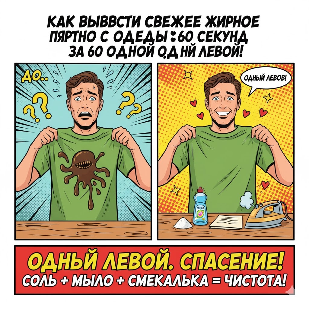 ОДНОЙ ЛЕВОЙ Как вывести свежее жирное пятно с одежды без стирки (за 60 секунд) Представьте себе. Вы сидите в ресторане, и, конечно же, капля масла или соуса падает прямо на вашу любимую рубашку или брюки. Жирное пятно моментально расплывается, и паника охватывает вас. Вам кажется, что вещь испорчена, а срочная стирка невозможна. Но это не так. Секрет жирного пятна в его природе: это масло, которое легко впитывается абсорбентами. Если действовать мгновенно, можно вытащить жир из волокон, не прибегая к большой стирке. Все эти трюки можно выполнить буквально одной левой, используя самые базовые и доступные средства. Совет: Как взять контроль над ситуацией и сохранить нервы Не позволяйте жирному пятну испортить вам день. Возьмите контроль в свои руки. * 1. Метод "Мгновенный Абсорбент" (Соль, Сода, Крахмал или Тальк). * Возьмите: Щепотку обычной поваренной соли, соды, крахмала или детской присыпки (талька). * Что делать: Как можно быстрее насыпьте выбранный порошок толстым слоем прям