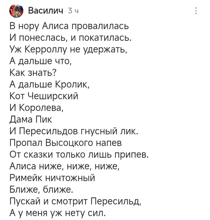 Но сначала стихи замечательные нашего Василича, как эпиграф: Мой не самый лучший и не честный, предвзятый отзыв о фильме, который я не смотрела и не стану смотреть. Да, вот такой пердимонокль. Не хочется абсолютно смотреть на то, как рушатся последние воспоминания детства, его ощущения от замечательной сказки Люиса Кэррола. Вы знаете, я и мульт не особо любила, по песням Высоцкого, но сейчас понимаю, что это была неумная позиция ребенка. Мультфильм был дико стильным по тем временам. Импортным. И песни для него Высоцкий писал как раз в то время, когда Марина Влади сыграла Алису во Франции. Может поэтому у меня было такое ощущение? Попробую объяснить это на примере одной из моих первых детских книг. Дело в том, что будучи малявкой еще, я жила год в Эстонии, и часто болела тогда. Мама купила мне книжку красивую, красочную, чтобы меня развлечь. Про принцессу Тимбу- Лимбу, вроде бы. У нее были желто - красные волосы, дикий макияж и экстравагантнейшие наряды по тем временам. Вот точно