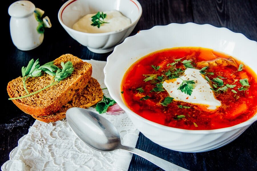 Борщ — сытное и питательное блюдо. Его обычно готовят на мясном бульоне с обжаренными овощами, такими как капуста, картофель и помидоры. Для вкуса можно использовать укроп, лавровый лист, майоран, хрен, имбирь и даже чернослив. Иногда для белка добавляют говядину или рыбу, а некоторые предпочитают вегетарианское блюдо.