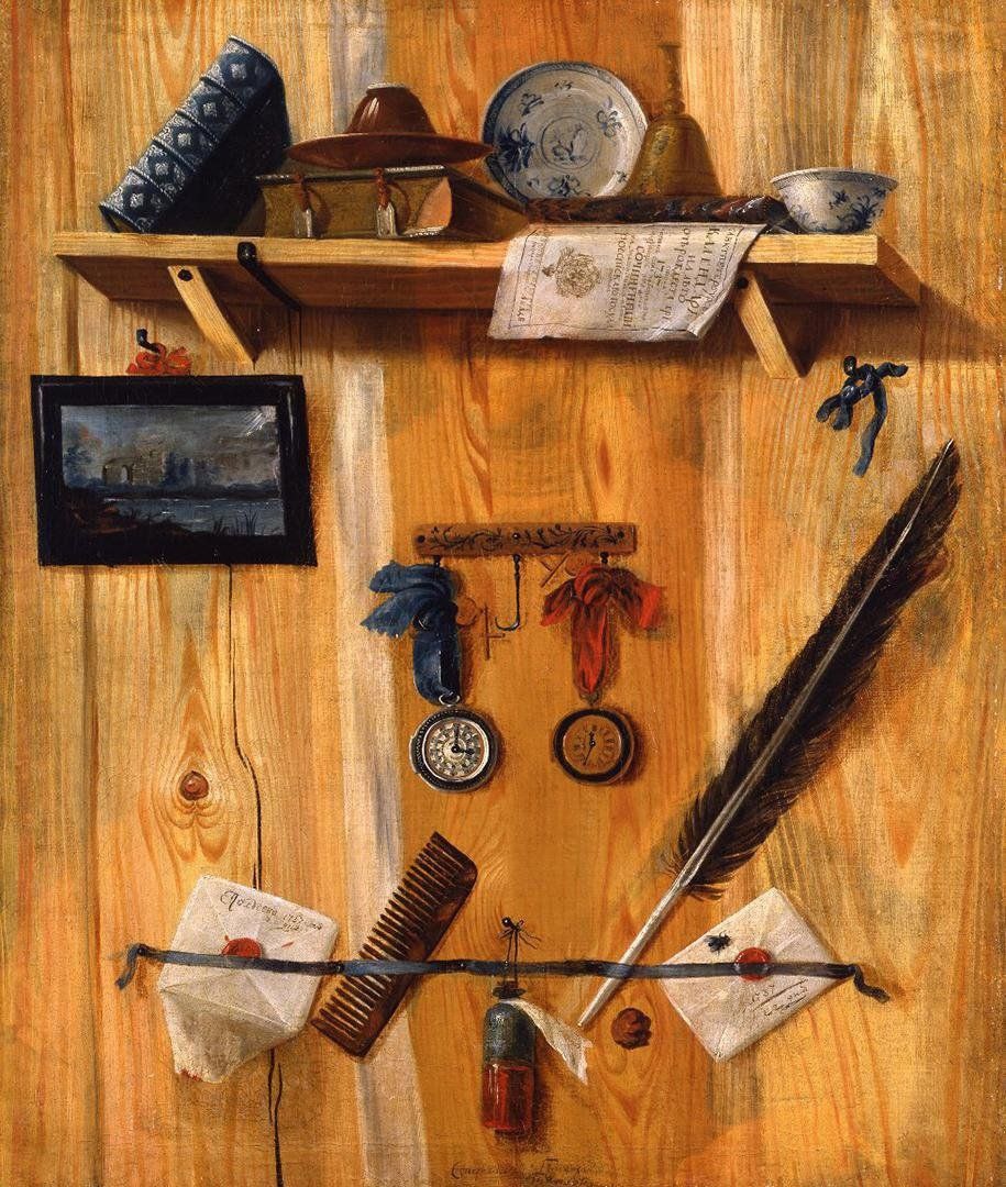 Г. Н. Теплов, Натюрморт-обманка. Ок. 1737 г. Государственный Эрмитаж Обманки в искусстве называются французским словом тромплёй (фр. trompe-l’oeil – обман зрения). В данном случае, художник создает иллюзию объемных предметов на стене. 🦉Забавно, как работают визуальные ассоциации - первое, что я увидела, глядя на эту картину, это два письма из Хогвартса🫣 #эрмиtag #эрмитажныйблогер