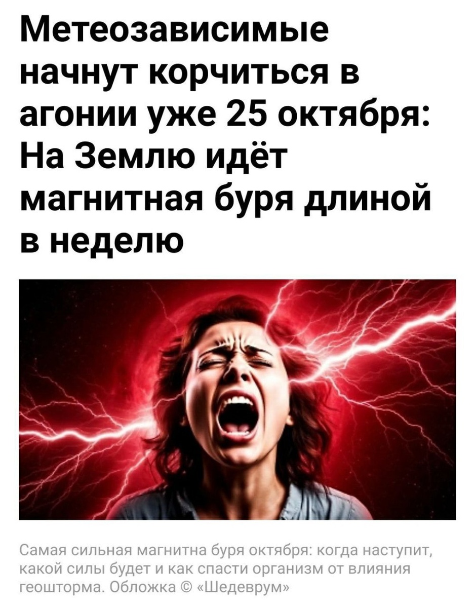 🔴 Магнитная буря накроет Землю уже ЗАВТРА и продлится ДО КОНЦА месяца. Пик активности — в среду и четверг. Именно тогда у метеозависимых ожидаются головные боли, бессонница и скачки давления. Врачи советуют заранее высыпаться, не перенапрягаться и держать под рукой таблетки от головы 🤕 CtrlAltDelights- подписаться