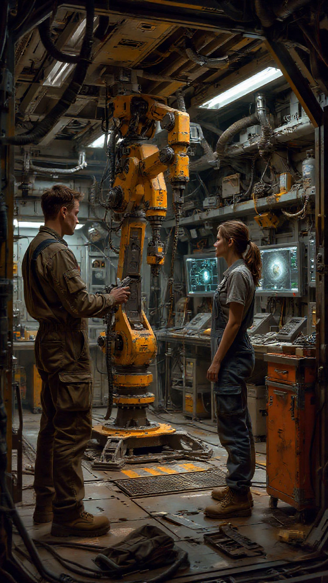 Грузовой отсек «Возрожденца» жил своей привычной жизнью — жизнью механического сердца, в котором бились ритмы сварки, шипение пневматики и мерцание диагностических экранов. В воздухе висел терпкий коктейль запахов: озон от плазменного резака, сладковатый дымок припоя и горьковатый аромат перегретого металла. В центре этого царства инженерной мысли, подвешенный на грузоподъемниках, красовался скелет старого гидравлического манипулятора. С него были сняты обшивка и часть силовых приводов, обнажив сложное переплетение трубок и кабелей.