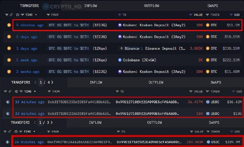 💸 Bitcoin OG перевел еще 100 BTC ($11,1m) на биржу Kraken