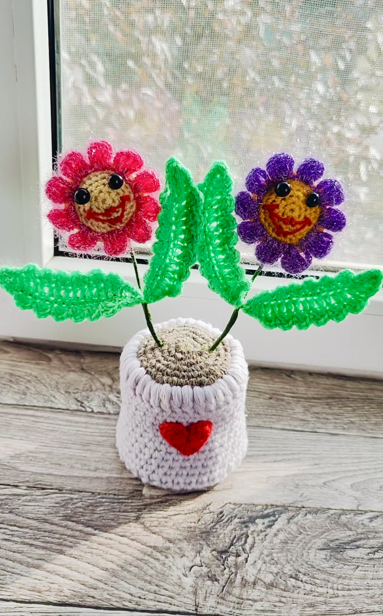 Я уже вязала крючком похожие цветочки в горшочках.На канале есть описание вязания цветка,горшочка,листьев.. На Рутубе есть видеоролик,проходите по ссылке На нашем окошке появился весёлый цветничок из пяти цветочков в горшочках🌸В каждом горшочке находится один цветочек. Для вязания своих работ я использовала пряжу разную по составу и цвету /остаточки пряжи/. Пряжа у меня осталась,и по своей новой задумке я связала два цветочка,поместив их в одном горшочке.Вывязала крючком маленькое сердечко (/по схеме из интернета/)и пришила его на горшочке. Поскольку,в горшочке я решила поместить два цветочка,то его немного увеличила в размере; вывязывала на 40 петлях. 🌸🌸🌸🌸🌸🌸🌸🌸🌸🌸🌸 На просторах интернета можно найти много идей для вдохновения по вязанию цветочков в горшочках..Некоторые фото я положила себе в копилку, делюсь с вами! Спасибо авторам за творчество!!! 🌸Вот такие два цветочка находятся в горшочке! 🌸В один горшочек можно поместить и три цветочка! Цветочки связаны из
