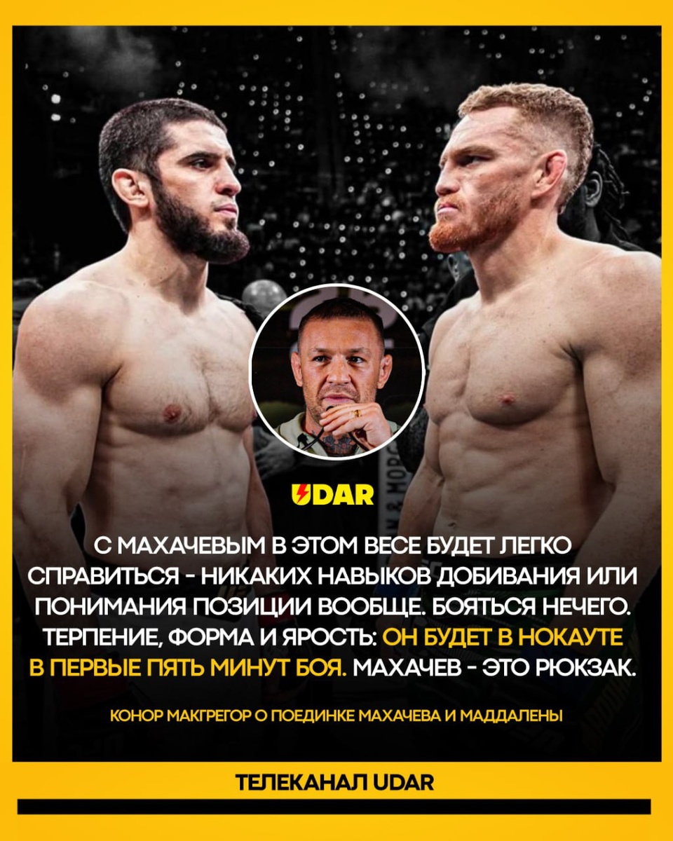 ⚡️Махачев упадет в нокаут в первом раунде. Звезда UFC Конор Макгрегор дал прогноз на бой Маддалены и Ислама Махачева, который пройдет 15 ноября в США: 💬 "С Махачевым в этом весе будет легко справиться — никаких навыков добивания или понимания позиции вообще. Он в лучшем случае — рюкзак. Бояться нечего. Терпение, форма и ярость — и он будет в нокауте в течение пяти минут!" - рассказал Конор. Как думаете, Махачев победит Маддалену? 🔥 - Да, конечно