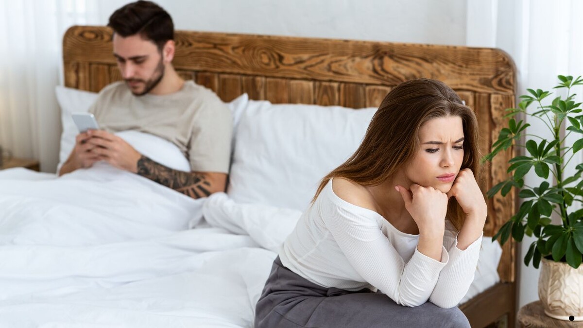 Вторая пара очень похожа на первую: мужчина также сидит, активно занимаясь чем-то в телефоне, а его супруга выглядит очень молодо.