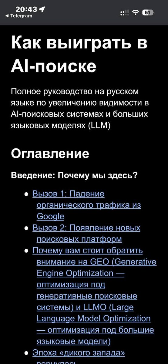 Я закончила перевод единственного пока что в мире руководства по ai-поиску и как бизнесу адаптироваться под него, с практическими рекомендациями. Прикладываю оглавление. Кому-то интересно погрузиться в такой документ? Там 50 с небольшим страниц. Надо вникать. Я своим командам, с кем работаю уже отправила и в спринт обязательной задачей поставила штудировать. Вот думаю, выкладывать в открытый доступ?