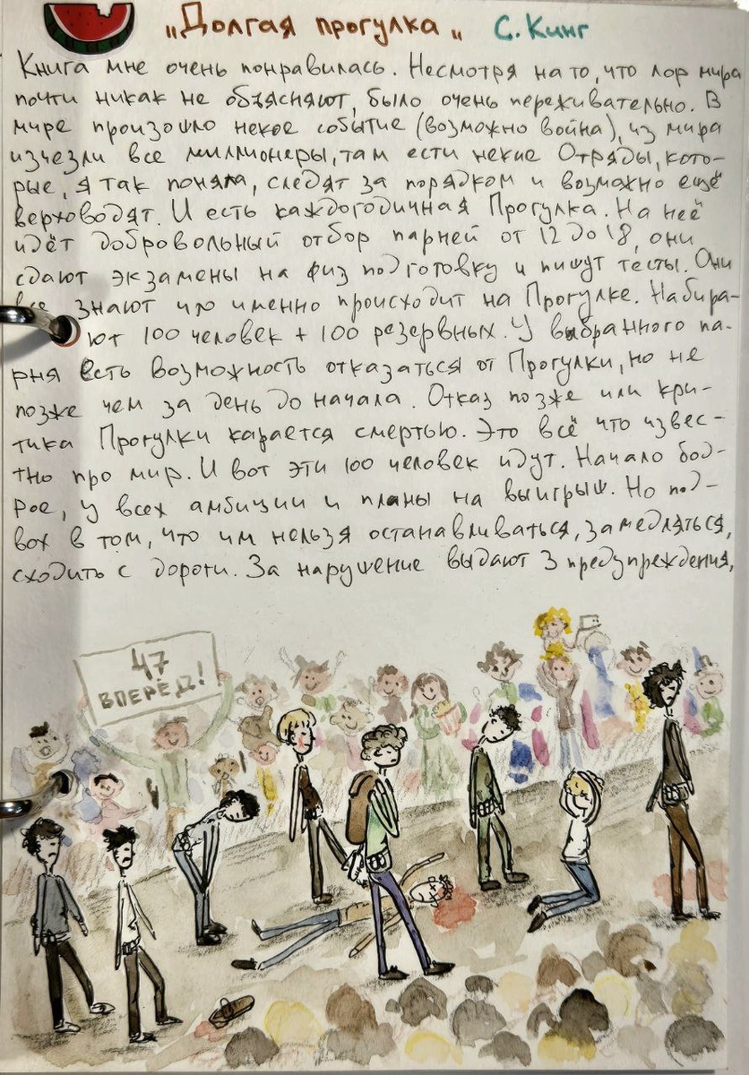Книга мне очень понравилась. Несмотря на то, что лор мира почти никак не объясняют, было очень переживательно. В мире произошло некое событие (возможно война), из мира исчезли все миллионеры, там есть некие Отряды, которые, я так поняла, следят за порядком и возможно ещё и верховодят. И есть каждогодичная Прогулка. На неё идёт добровольный отбор парней от 12 до 18, они сдают экзамены на физ подготовку и пишут тесты. Они все знают что именно происходит на Прогулке. Набирают 100 человек + 100 резервных. У выбранного парня есть возможность отказаться от Прогулки, но не позже чем за день до начала. Отказ позже или критика Прогулки карается смертью. Это всё что известно про мир. И вот эти 100 человек идут. Начало бодрое, у всех амбиции и планы на выигрыш. Но подвох в том, что им нельзя останавливаться, замедляться, сходить с дороги. За нарушение выдают 3 предупреждения, на 4 «выдают билет», то бишь контрольный в голову. Еду раздают раз в день, в тюбиках, как для космонавтов, вода в любое вр