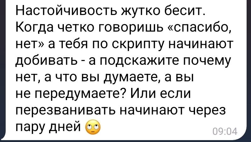 Жёсткие скрипты в продажах VS человеческая коммуникация: что победит? На днях в моей (и вашей) любимой рубрике про "бесячки" вскрылась крутая тема, которую хочу вынести на обсуждение👇🏻 "Настойчивость жутко бесит. Когда чётко говоришь "спасибо, нет", а тебя по скрипту начинают добивать - а подскажите, почему нет, а что вы думаете, а вы не передумаете?... Или начинают перезванивать через пару дней" ——— В примере выше 🔼 ноль эмпатии, доверия и ощущения, что о тебе заботятся и хотят помочь. Чисто скрипт. И в этот момент ты понимаешь, что на тебя глобально пох**. Ты - просто строчка в CRM-ке или в списке на отработку. В какой-то момент настойчивость перестаёт быть проявлением интереса и превращается в давление. Ты чувствуешь, что тобой управляют, а не разговаривают. ——— Я убеждена: коммуникация решает всё. И именно она становится точкой провала или успеха на рынке для большинства экспертов, предпринимателей и специалистов. Вся сложность заключается в том, что большинство людей