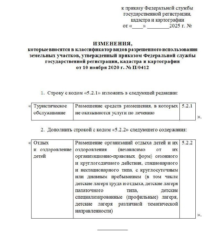 Росреестр уточняет классификатор видов разрешенного использования земельных участков ⚡ Подготовлен проект приказа, вносящий изменения в классификатор ВРИ. В чем суть? 🔹Уточнено описание вида разрешенного использования с кодом 5.2.1 «Туристическое обслуживание». Теперь оно конкретно указывает на размещение средств размещения, в которых не оказываются услуги по лечению. 🔹Введен новый вид разрешенного использования с кодом 5.2.2 «Отдых и оздоровление детей». Он предусматривает размещение организаций для детского отдыха и оздоровления всех типов (лагеря труда и отдыха, палаточные, профильные и т.д.). 🔹Изменения направлены на приведение классификатора в соответствие с актуальными потребностями в использовании земель. 📍Проект Приказа Росреестра "О внесении изменений в классификатор видов разрешенного использования земельных участков, утвержденный приказом Федеральной службы государственной регистрации, кадастра и картографии от 10 ноября 2020 г. № П/0412 " (https://clck.ru/3Pv49f)